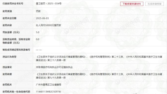 至于其他医疗程序上的,比如无证执业,据信用中国信息显示,2025年年6月份广州番禺爱尔眼科医院有限公司未取得医疗机构执业许可证擅自执业被处以5万元的罚款。