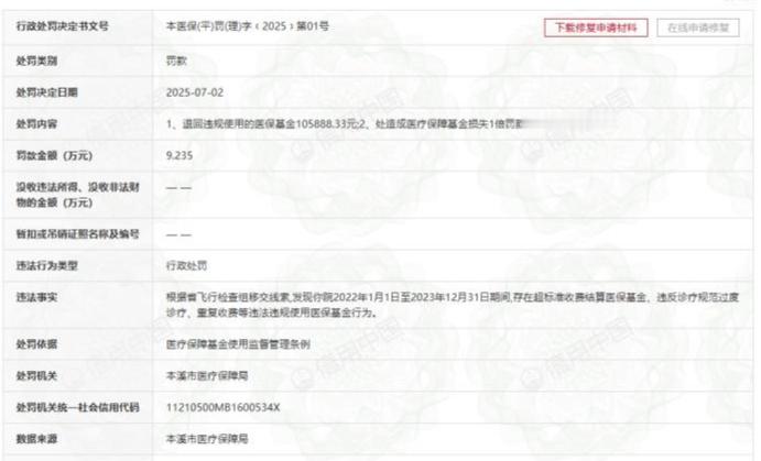 2025年7月初,子公司本溪爱尔眼科医院有限公司被省飞行检查组移交线索,当地部门核查发现2022年1月1日至2023年12月31日期间,该院存在超标准收费结算医保基金、违反诊疗规范过度诊疗、重复收费等违法违规使用医保基金行为,造成医保资金损失,被处以9.24万元的处罚,退回违规使用的10.59万元。