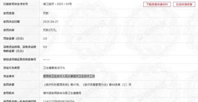 2025年4月份,靖州爱尔眼科医院有限公司因使用非卫生技术人员从事医疗卫生技术工作被查处。