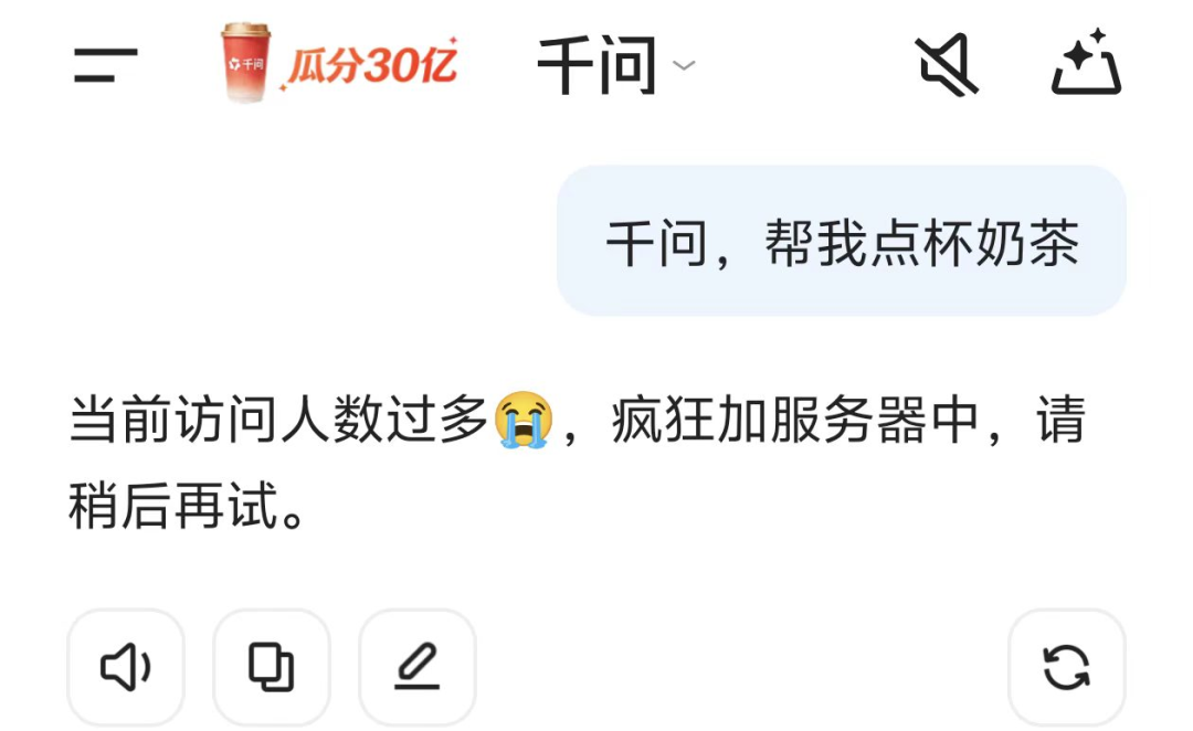 活动上线后,不少网友反馈,千问明显出现卡顿,“千问请客”页面无法点击,页面信息显示“系统开小差了,稍后再试吧”。有用户对记者反馈,除活动页面外,问答功能仍可正常使用。