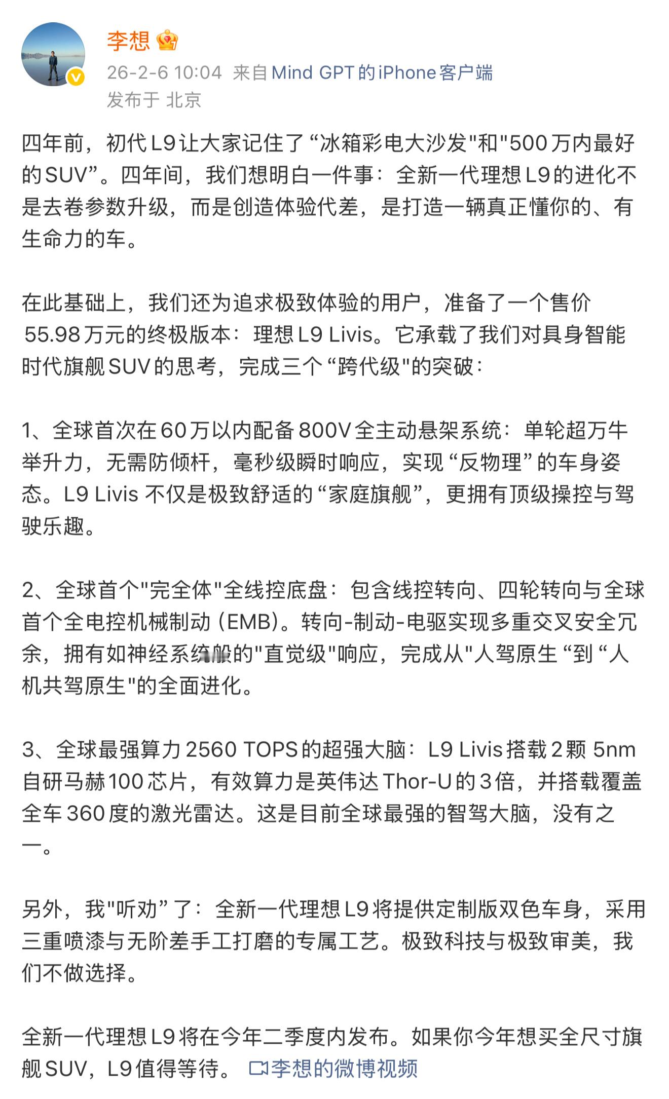 单轮万牛举升力的800V全主动悬架,搭配线控转向+四轮转向的全线控底盘,还有2560 TOPS算力的智驾大脑,这些配置都在围绕体验做升级,不是盲目卷参数。全新一代理想L9