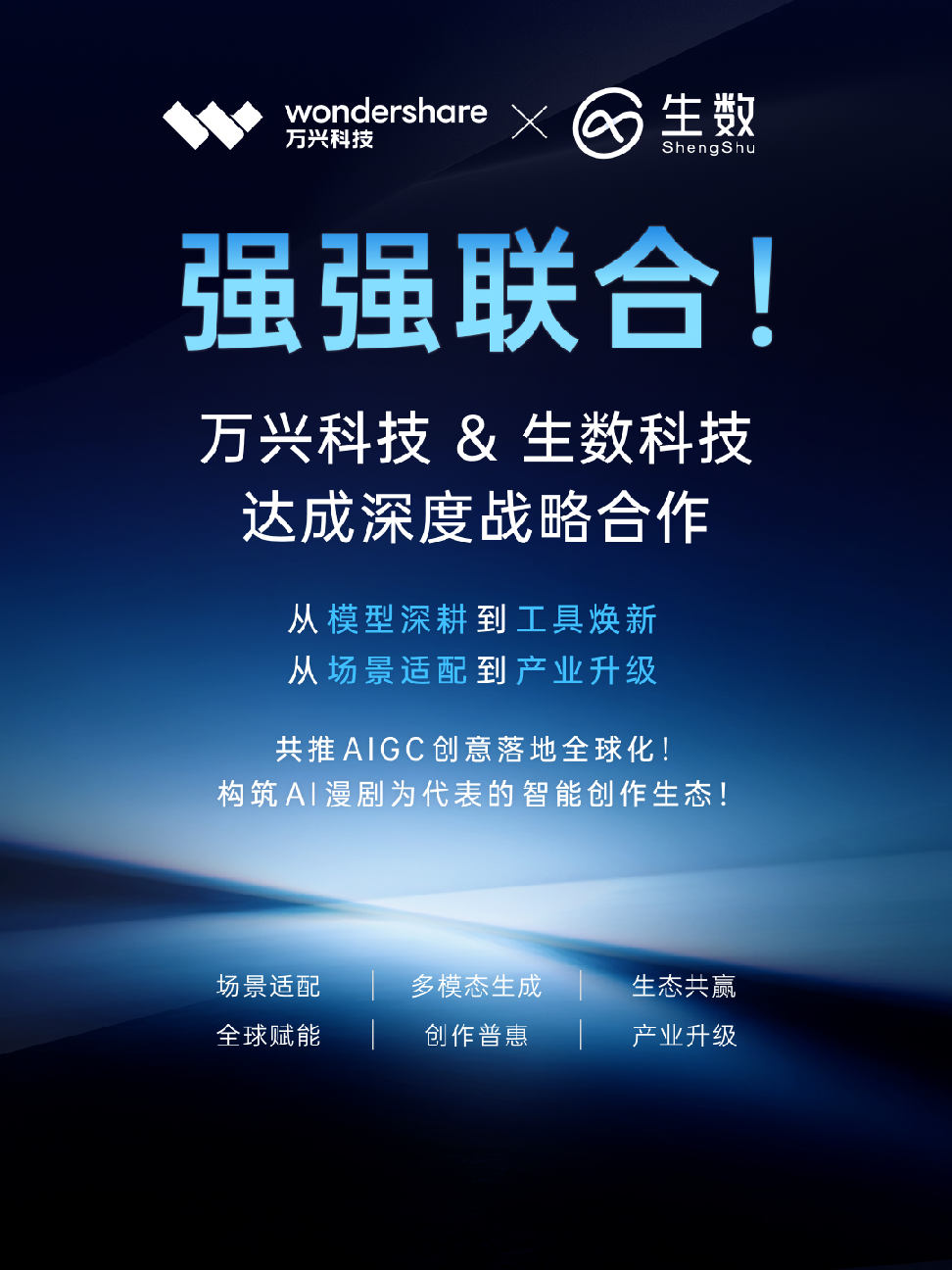 据悉,此次双方强强联合,旨在充分发挥各自优势,共同加速AI技术在数字创意,尤其是漫剧领域的深度融合及规模化落地,包括基于生数科技ViduAI漫剧大模型,结合万兴科技全球解决方案,全面构建AI漫剧“生态+技术”完整闭环;通过产品与模型共创,打造面向未来的漫剧创作工具;联合推进多模态大模型在视频生成、图像生成等场景的技术创新与应用;共建面向专业创作者和企业的AIGC工具链与解决方案,构建共创共享共赢的AIGC应用生态体系等,共绘AI漫剧为代表的AIGC内容产业新蓝图。