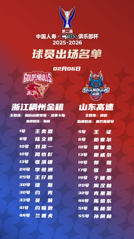 虎扑02月06日讯今日CBA俱乐部杯,山东对阵浙江的大名单已经公布。