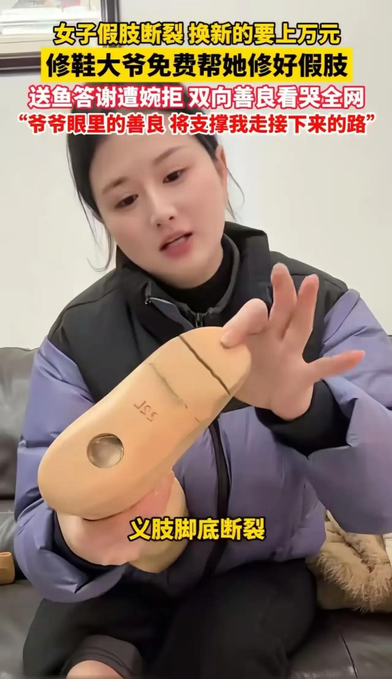 一大早看哭了!江苏无锡,女子假肢断裂,医生说换新的上万元,女子没钱,就拿着假肢问修鞋大爷能不能修?修鞋大爷修了一辈子的鞋子,从来没修过假肢,但他看到女子这么可怜,还是帮女子修好了!可是女子问大爷多少钱,大爷居然说…… “没钱就不用付了。” 大爷的眼里没有一丝犹豫,只是轻轻一笑,仿佛在说:“这点小事,帮帮忙,何必计较。” 这句话像一股暖流,瞬间融化了许多人的心。我们常说“善意无价”,但在这个快节奏、利益至上的社会,像大爷这样无私的善举,真的少之又少。或许,他只是一个普通的修鞋匠,但他的行为,却让我们看到了人性中最纯粹、最温暖的一面。 这件事背后,隐藏着多少社会的真实写照?在这个物质至上的时代,多少人面对困境时,选择了自私、逃避?而那些愿意伸出援手的人,又在哪里?或许他们就在我们身边,只是我们没有去发现,没有去感受。 更令人深思的是,这个女子的故事。她没有选择放弃,没有因为经济困难而绝望,而是用一种朴实的方式,寻求帮助。她的坚韧、善良,或许比任何金钱都珍贵。她用自己的行动告诉我们:困难只是暂时的,只要心中有希望,就一定能找到光。 这件事引发了社会的广泛关注,也让我们反思:我们每个人都能成为那一束光吗?在别人的黑暗中,伸出援手;在别人的绝望中,点亮希望?或许,我们都能从这个普通修鞋大爷的善举中,学到一些人生的真谛。 在这个充满挑战的时代,正能量尤为珍贵。它不一定要轰轰烈烈,但每一次善意的付出,都能点亮别人的人生,也让我们的社会变得更加温暖。希望每个人都能像那位修鞋大爷一样,用行动去传递爱,用心去感受生活中的每一份善意。 让我们一起,成为那一束温暖的光,让这个世界,因为我们的善良,而变得更加美好。你,准备好了吗?下一次,当你遇到需要帮助的人时,是否也会像那位大爷一样,伸出你的手?因为,也许,你的一个善举,就能改变一个人的一生。假肢修复 假肢残疾人