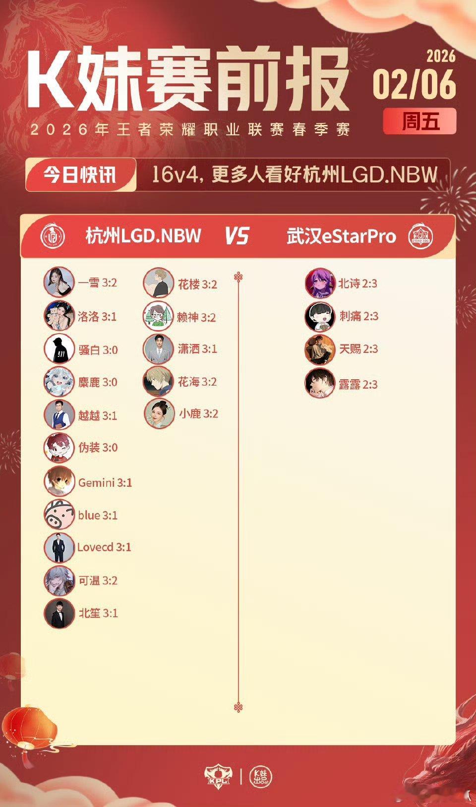 2026kpl春季赛 |K妹赛前报16v4,更多人看好杭州LGD.NBW;1v2