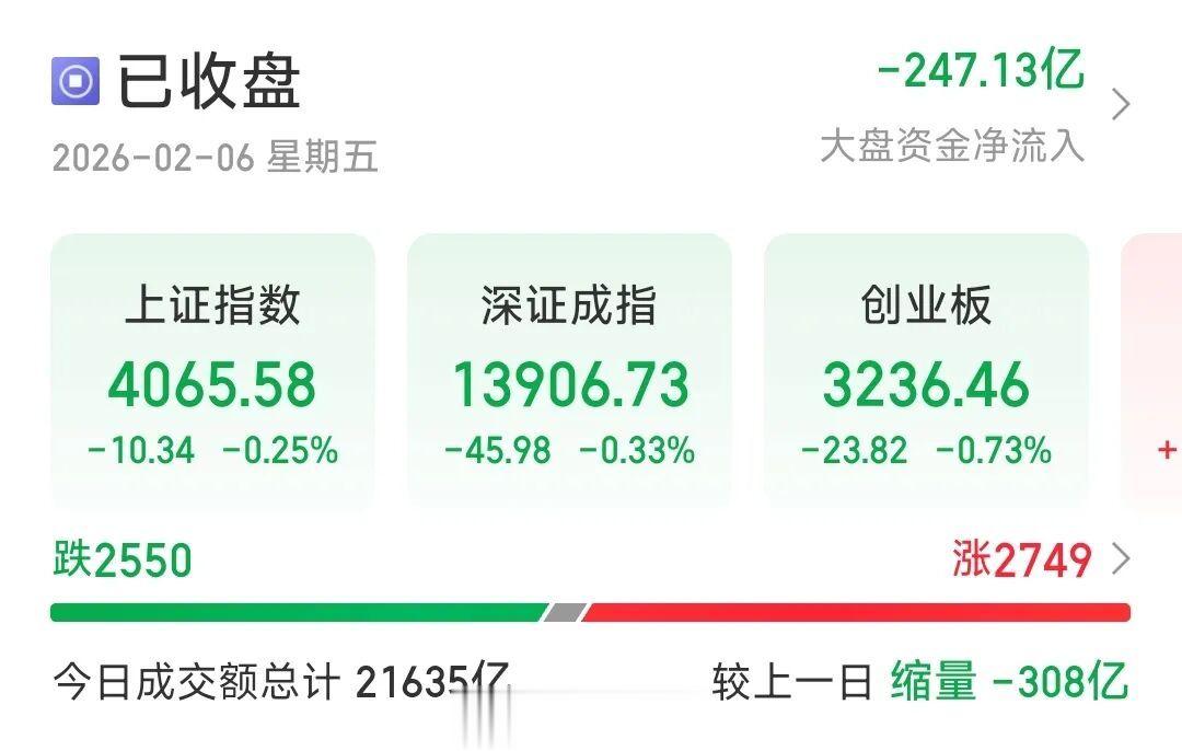 中国商报(记者马文博)2月6日,A股三大指数集体下跌。截至收盘,沪指跌0.25%,深成指跌0.33%,创业板指跌0.73%,北证50指数涨0.9%。沪深京三市成交额为21635亿元,较上一日缩量308亿元,三市超2700只个股上涨。