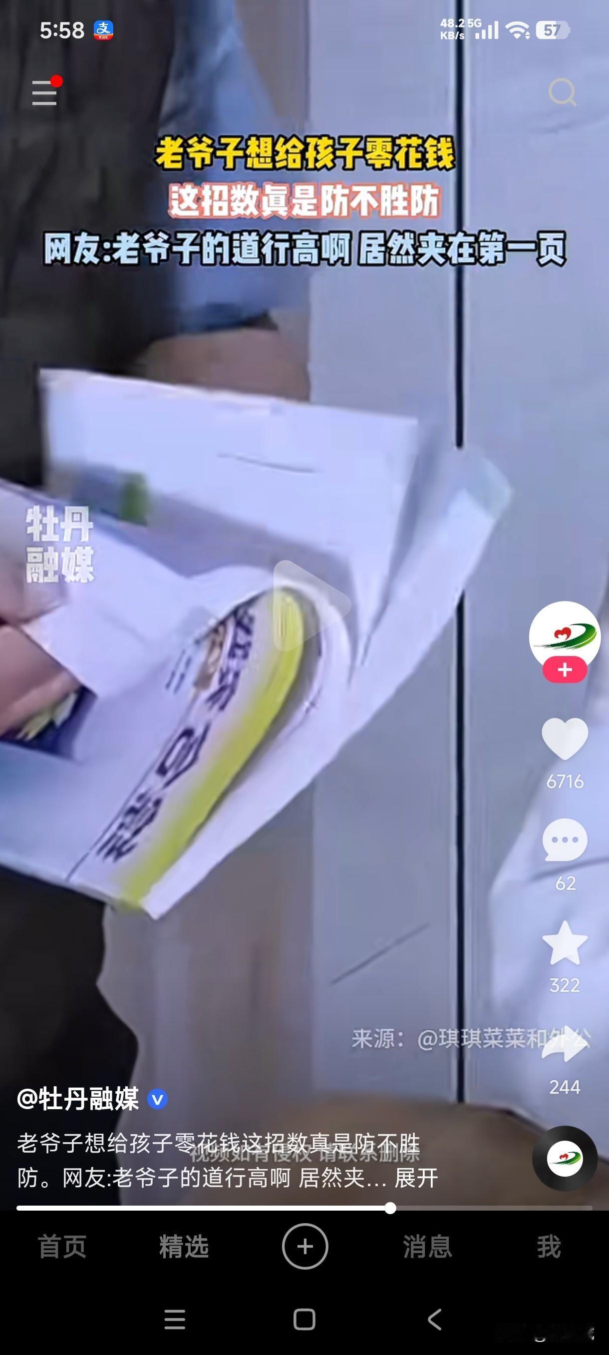 爷爷想给孙女点零花钱咋就那么难呢? 这操作可真是螳螂捕蝉黄雀在后,稍不留神就被贼眉鼠眼的孩子爹给独吞了,给孙子的钱咋能让儿子坐享其成呢? 果然姜还是老的辣,这老爷子的道行确实高,最危险的地方往往最安全,当着孩子爹的面给了孙子一本书,孩子爹看到立马翻书查找是不是夹钱了,但他翻了一通什么也没有,于是又把书还给了孩子,但孩子翻的时候一把里翻到了钱了,原来老爷子把钱夹在了第一页,谁都没想到这才是真正的高人,爷爷疼爱孙女想给点零花钱咋那么难呢?