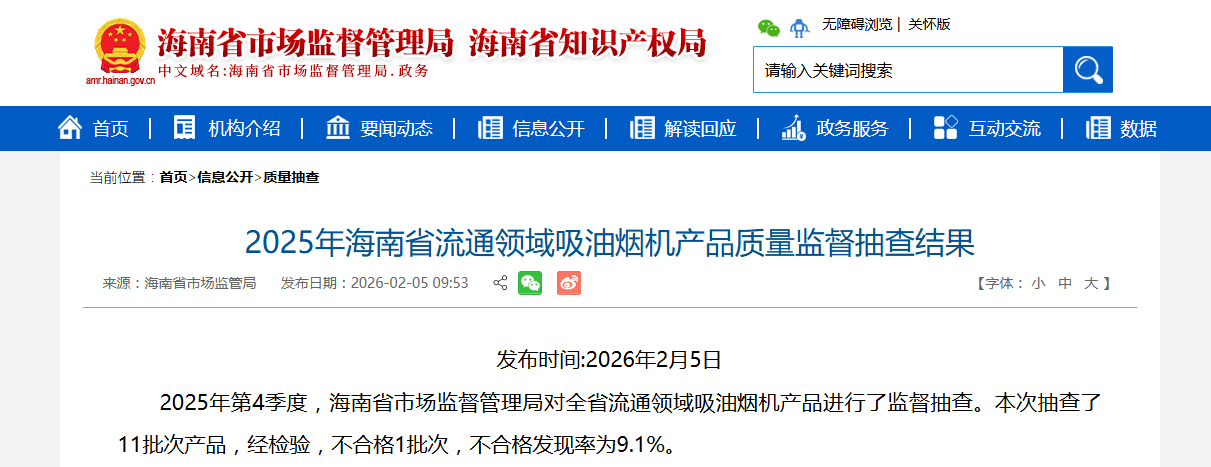 2025年第4季度,海南省市场监督管理局对全省流通领域吸油烟机产品进行了监督抽查。本次抽查了11批次产品,经检验,不合格1批次,不合格发现率为9.1%。