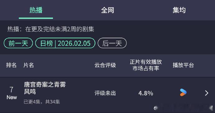 唐宫奇案首播云合白鹿唐宫奇案云合4.8% 《唐宫奇案之青雾风鸣》首播告捷,2 月 5 日双平台开播,云合首播数据达到 4.8%