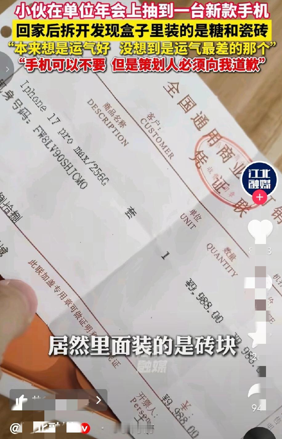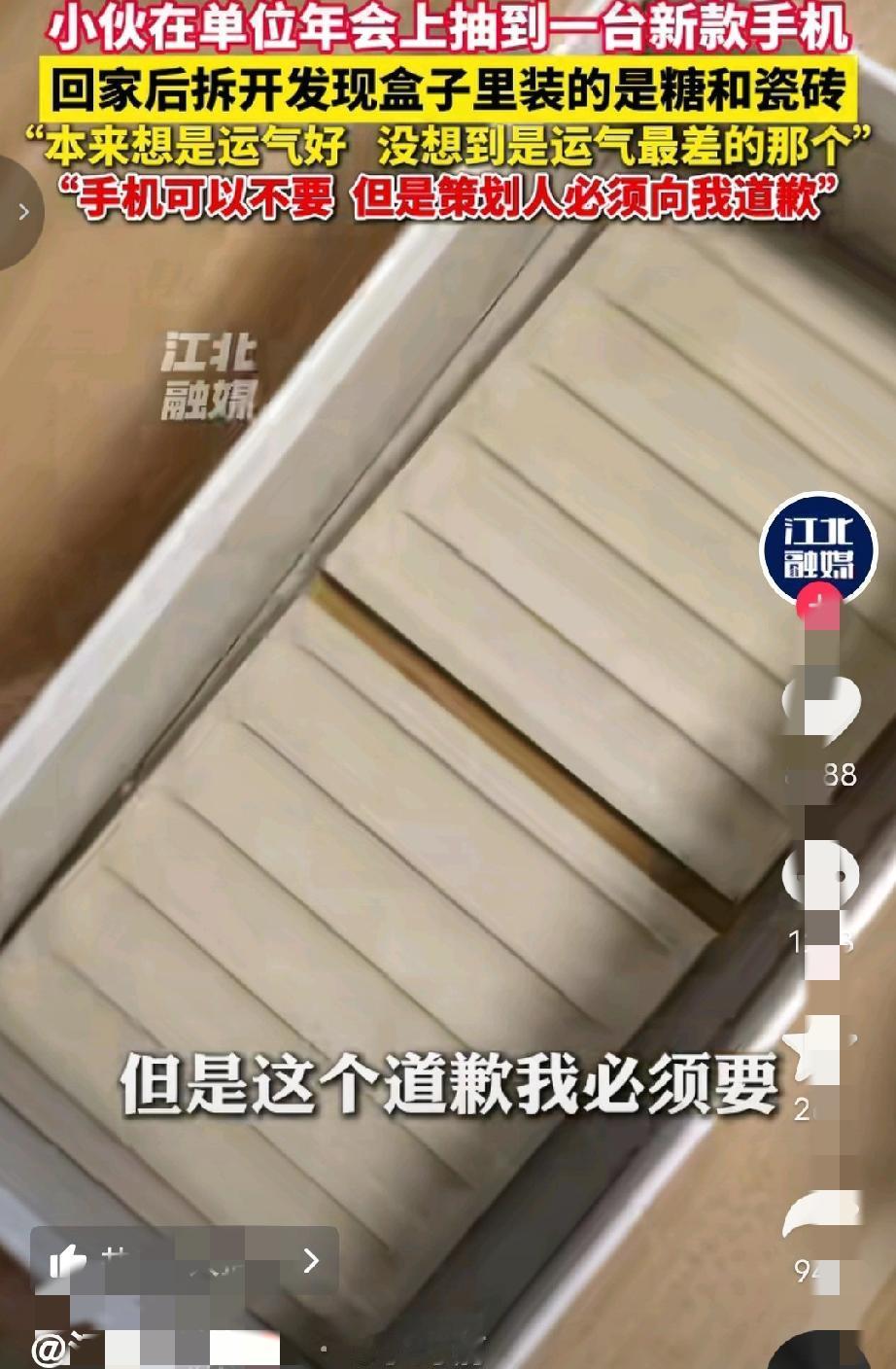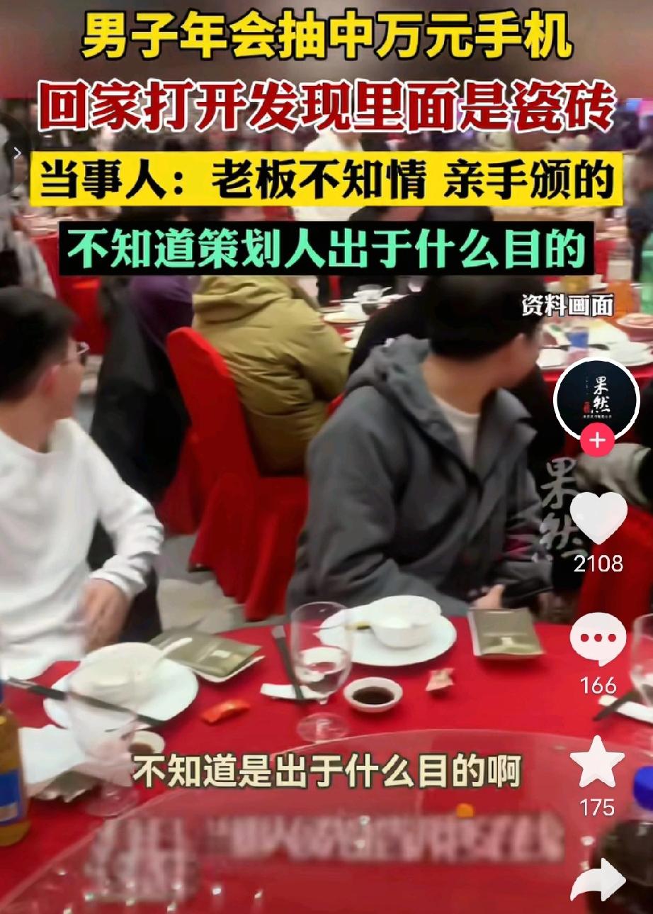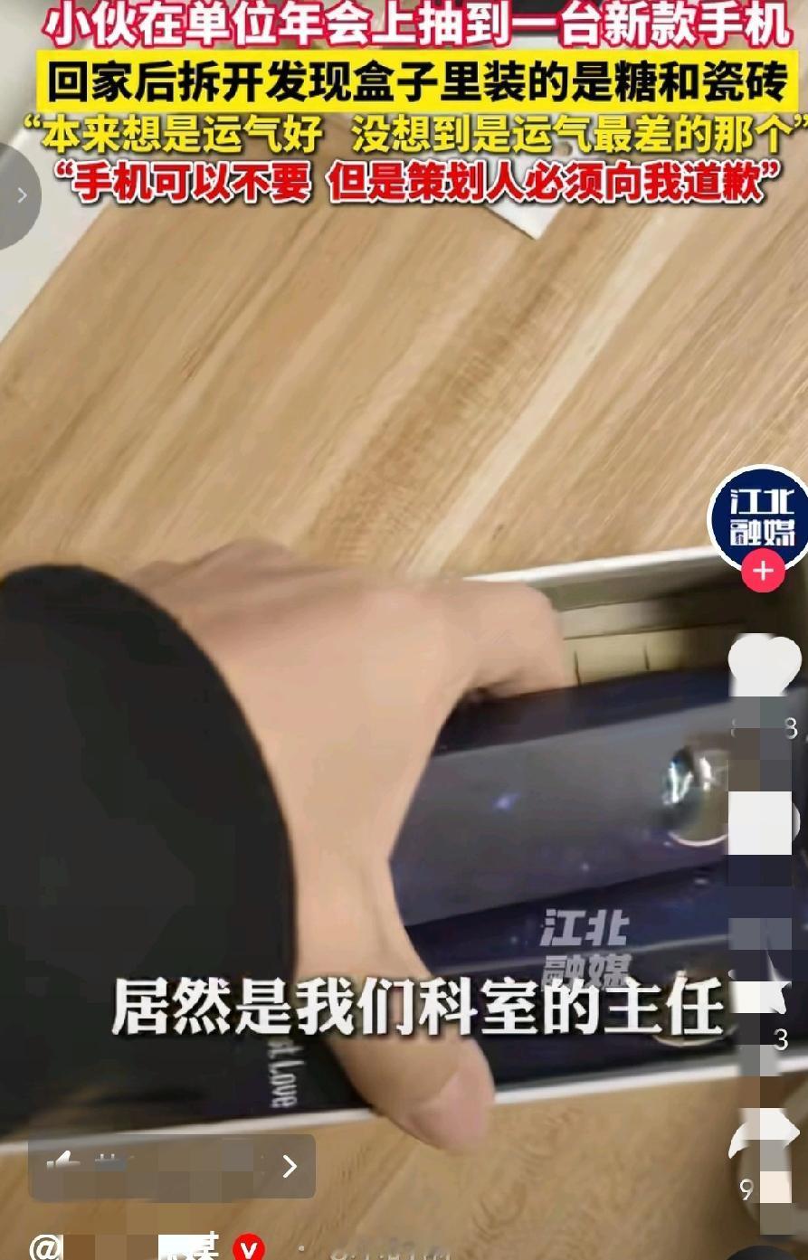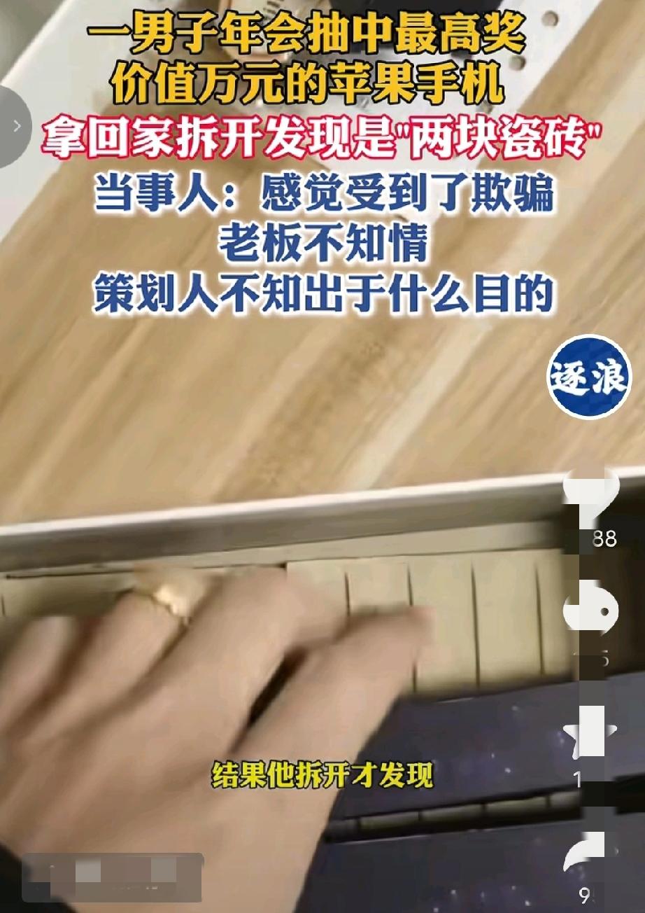 “本来想是运气好,没想到是运气最差的那个!”广东珠海,男子在年会抽奖,得了特等奖,奖品是价值9988元的手机,老板亲自颁奖后,男子并没有当场拆开,想着回家给妻子一个惊喜,不料,二人拆开后,里面居然是两块瓷砖,男子很气愤:“手机可以不要,但要给他道歉! 2月5日,广东珠海,一公司年会到了让大家热血沸腾的抽奖环节了,这次的特等奖设置的是一款价值9988元的手机。 每个人都翘首以盼,都希望自己是这次的幸运儿,虽然奖项只有一个人可以得到,但员工们还是挺热情的,到了老板宣布获奖得主时,大家还是送上了热烈的掌声,让这次年会气氛上了一个台阶。 当侯先生听到自己的名字后,也是激动不已,如此运气居然落在他的头上,马上跑到台上领了奖。 候先生想着回家给妻子一个惊喜,就没有当差拆开,但是,公司的所有员工都知道了他获得近万元手机这件事。 到令候先生没有想到的是,回到家他把手机交给妻子,妻子拆开后,二人一看,傻眼了:手机盒子里竟然只有两块瓷砖,哪有什么手机呀! 候先生当场就懵了:他明明看见有发票的。 这一刻他心里比吃了苍蝇还难受。 大家都知道他得奖了,可又有谁知道,盒子里竟是李代桃僵。 候先生越想越气,就去问年会策划人,这倒底是怎么回事。 而策划人也没避讳,直言说是自己整的蛊,只是为了活跃年会气氛,不是针对候先生,并且这件事,领导和老板都不知情。 现在候先生说,这个策划人是他们科室的主任,不管他出于什么原因,也不想要这个手机,只想让他给自己道歉。 其实,这个手机到底存在还是不存在也不重要了,重点在于,候先生原本就得不到手机,而是被人在特定的场合,不自觉的配合“演”了一场获大奖的戏,这也太冤了,所以,这件事支持候先生的做法,要让策划人道歉,澄清事实。