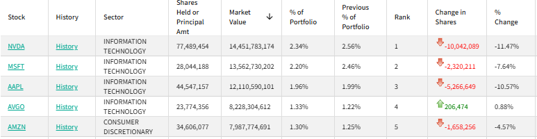 在前五大重仓股中,英伟达(NVDA.US)位列第一,持仓约7748.9万股,持仓市值约为144.5亿美元,占投资组合比例为2.34%,较上季度的持仓数量减少11.47%。