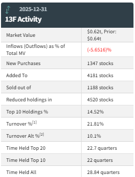 统计数据显示,瑞银第四季度持仓总市值达6200亿美元,环比减少5.65%。瑞银在第四季度的持仓组合中新增了1347只个股,增持了4181只个股。同时,瑞银减持了4520只个股,清仓了1188只个股。其中,瑞银的前十大持仓标的占总市值的14.52%。