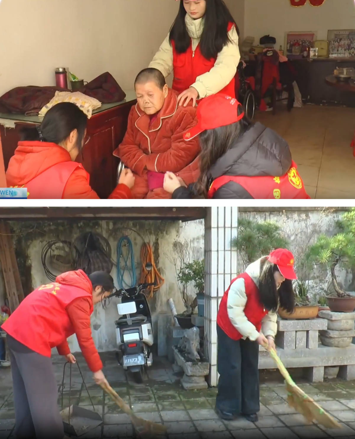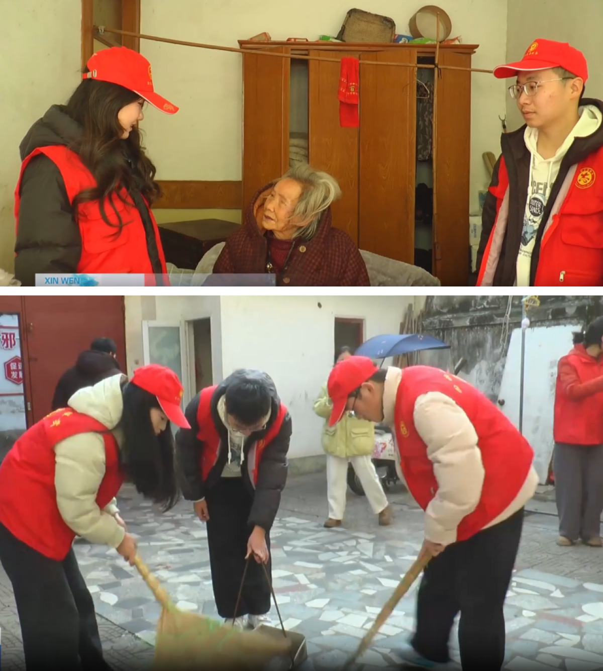 "奶奶,俺们是大学生返乡实践活动,回来然后之后来看看你,快过年了,给你带点吃的还有喝的。"