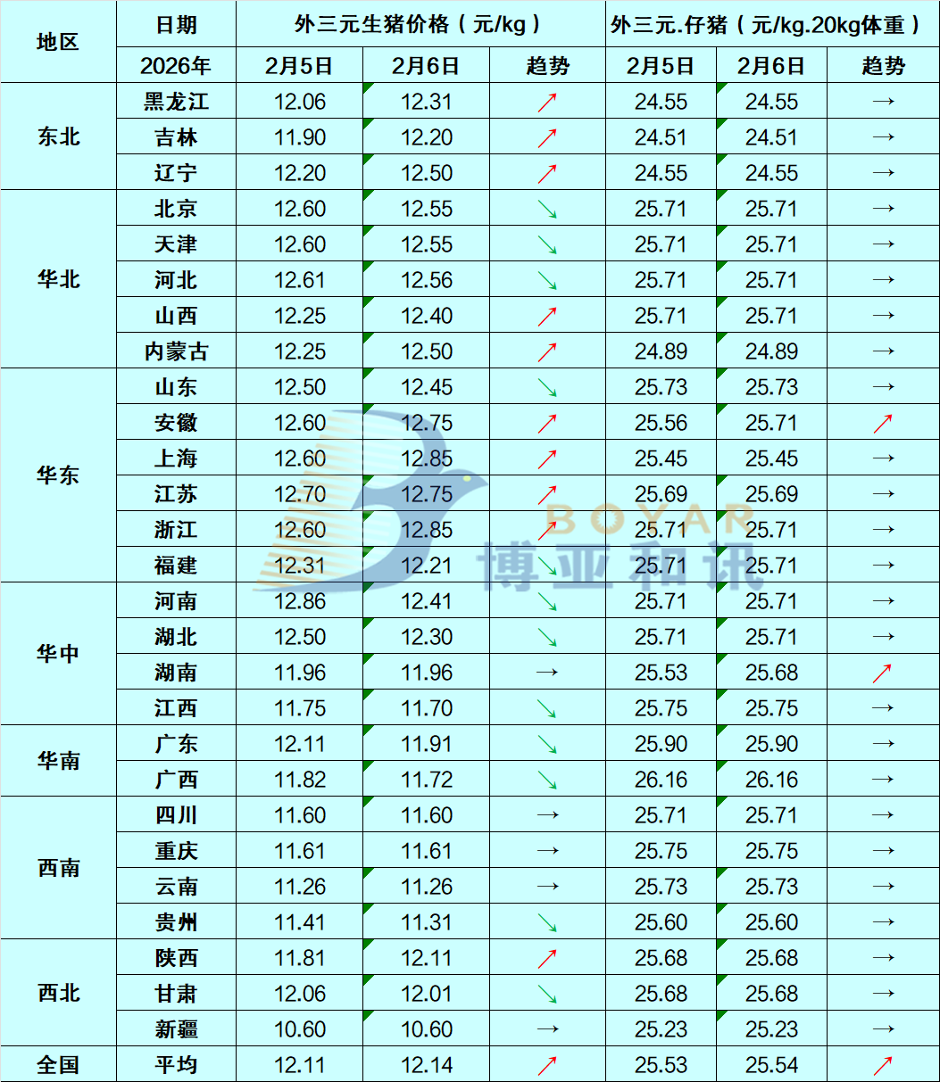 据博亚和讯监测,2026年2月6日全国外三元生猪均价为12.14元/kg,较昨日上涨0.03元/kg;仔猪均价为25.54元/kg,较昨日上涨0.01元/kg;白条肉均价16.66元/kg,较昨日上涨0.07元/kg;今日猪料比为3.63:1,较昨日持平。