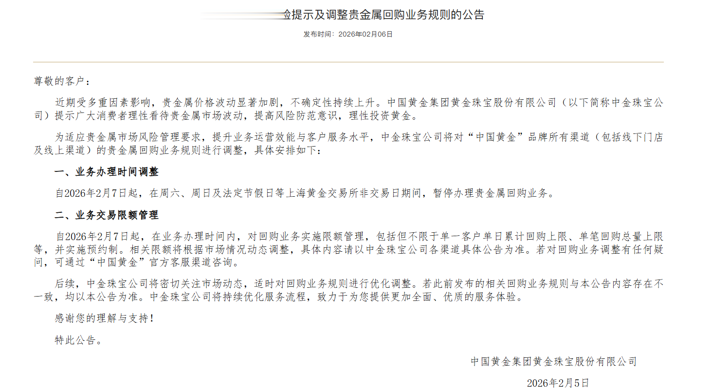 2月6日晚间,中国黄金集团黄金珠宝股份有限公司(简称:中金珠宝公司)公告,为适应贵金属市场风险管理要求,提升业务运营效能与客户服务水平,中金珠宝公司将对“中国黄金”品牌所有渠道(包括线下门店及线上渠道)的贵金属回购业务规则进行调整。