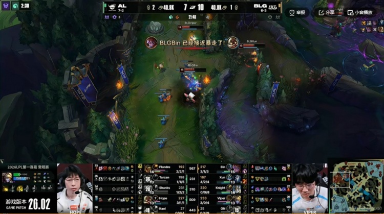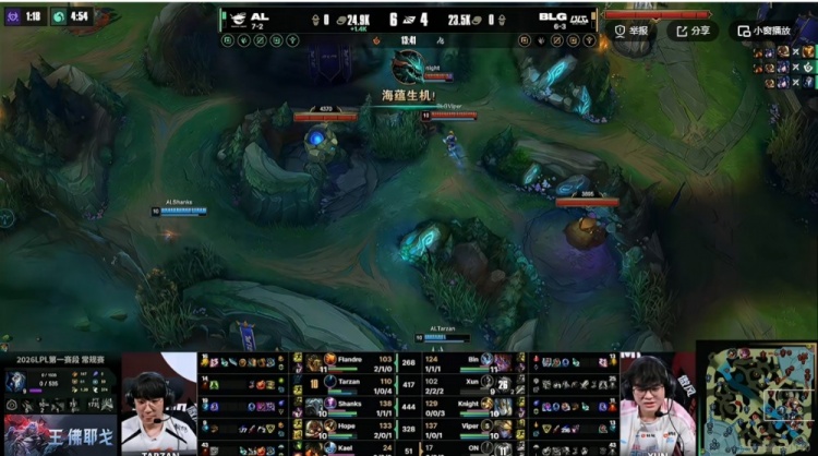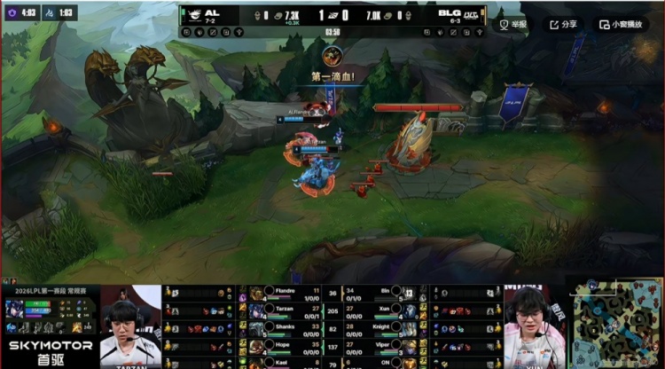 [18:02]AL中路强行动手Viper伊泽瑞尔但是ON巴德回头一个大招命中Hope库奇将他击杀!kael泰坦也被留住!打出0换2的BLG开先锋,但是Tarzan猪妹抢下先锋还坐地方巴德门跑了!BLG留住Flandre鳄鱼,但是追击猪妹去了结果先锋还被kael泰坦捡到了!随后AL中路直接放先锋,还可以拆掉BLG中一塔!