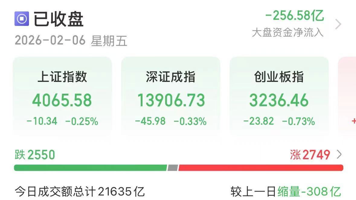 2月6日,A股三大指数集体收跌。截至收盘,沪指跌0.25%,收报4065.58点;深成指跌0.33%,收报13906.73点;创业板指跌0.73%,收报3236.46点。全市场成交额2.16万亿元,较昨日小幅缩量308亿元。
