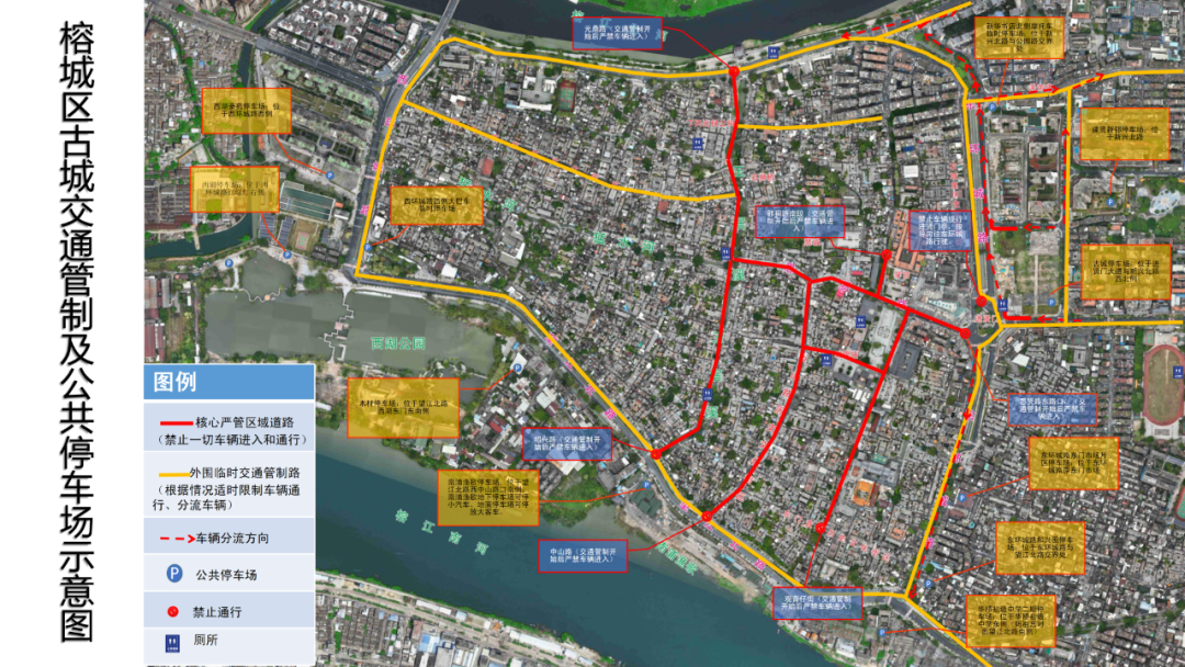 1.禁止一切车辆进入和通行的路段:思贤路、中山路、城隍路、韩祠路南段(禁城路口至思贤路)、观音仔街(东门直街至思贤路)、元鼎路、打铜街、绍兴路。