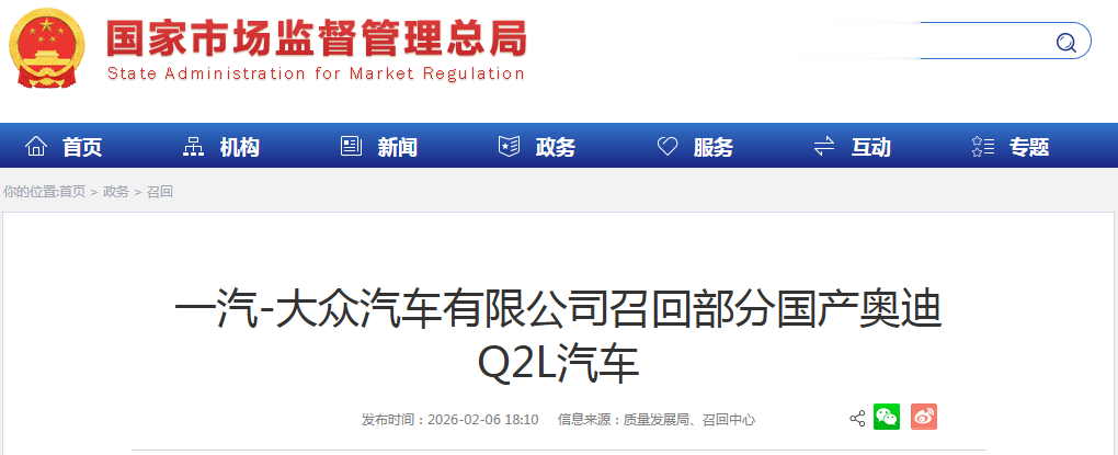 召回编号S2026M0020V:自2026年2月6日起,分批次召回2018年8月2日至2025年1月19日期间生产的部分国产奥迪Q2L汽车,共计206012辆。