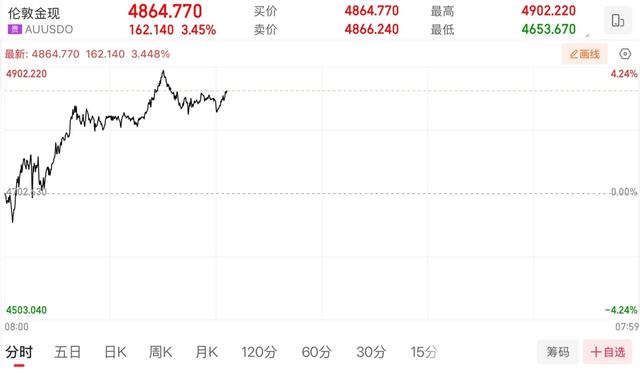 近期,国际黄金价格经历“过山车”式大幅波动,在遭遇40年来最大单日跌幅后,2月3日,国际金价又强势反弹。2月5日,贵金属市场抛售潮再度来袭,现货黄金一度跌近4%,失守4800美元每盎司关口。2月6日,现货黄金又重新站上4800美元每盎司。截至2月6日下午,伦敦金现报4864.77美元每盎司,涨3.45%。