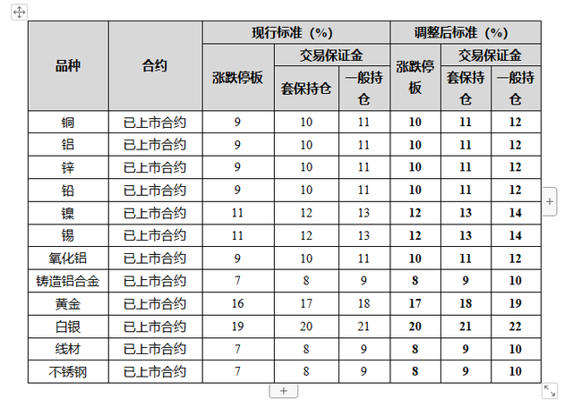 上期所通知,黄金、白银期货交易保证金均上调1个百分点,涨跌停幅度分别从16%、19%上调到17%、20%;铜、铝、镍、锡这些有色金属期货,交易保证金普遍上调1到2个百分点,比如原来交15%,现在可能要交16%或17%,价格每天能波动的最大范围也放宽1个百分点,避免交易瘫痪。