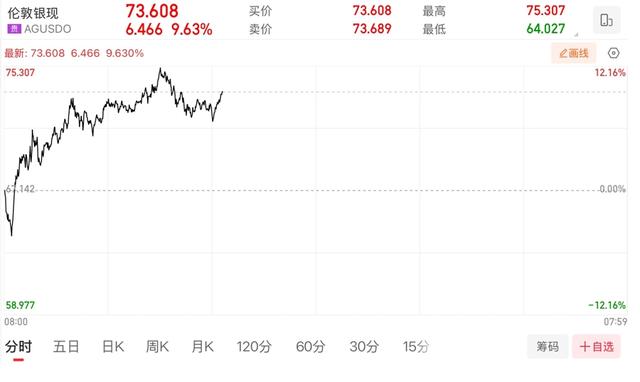 同样,国际白银价格在一度突破120美元每盎司后,于1月31日创下史上最大单日跌幅,一度跌超36%,最低触及74.28美元。2月3日起,银价开启反弹,回升至82到88美元区间。2月5日又历经一轮暴跌。截至2月6日下午,伦敦银现报73.61美元每盎司,涨幅9.36%。