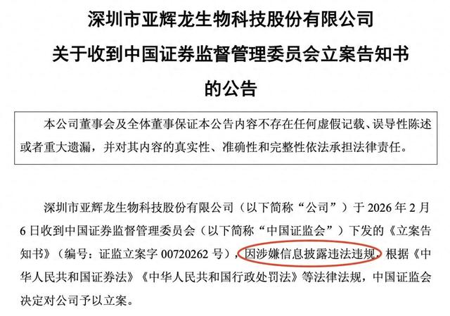 2月6日晚间,亚辉龙(688575)发布公告称,当天,该上市公司收到证监会下发的《立案告知书》,因涉嫌信息披露违法违规,根据相关法律法规,证监会决定对亚辉龙予以立案。