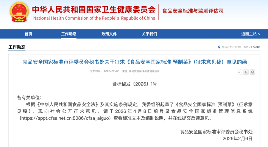 2月6日,国家卫生健康委发布了《食品安全国家标准预制菜》(征求意见稿)(以下简称“标准”),面向社会公开征求意见。