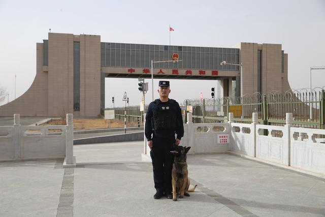 巡逻间隙,李春葳和警犬马可在国门下合影