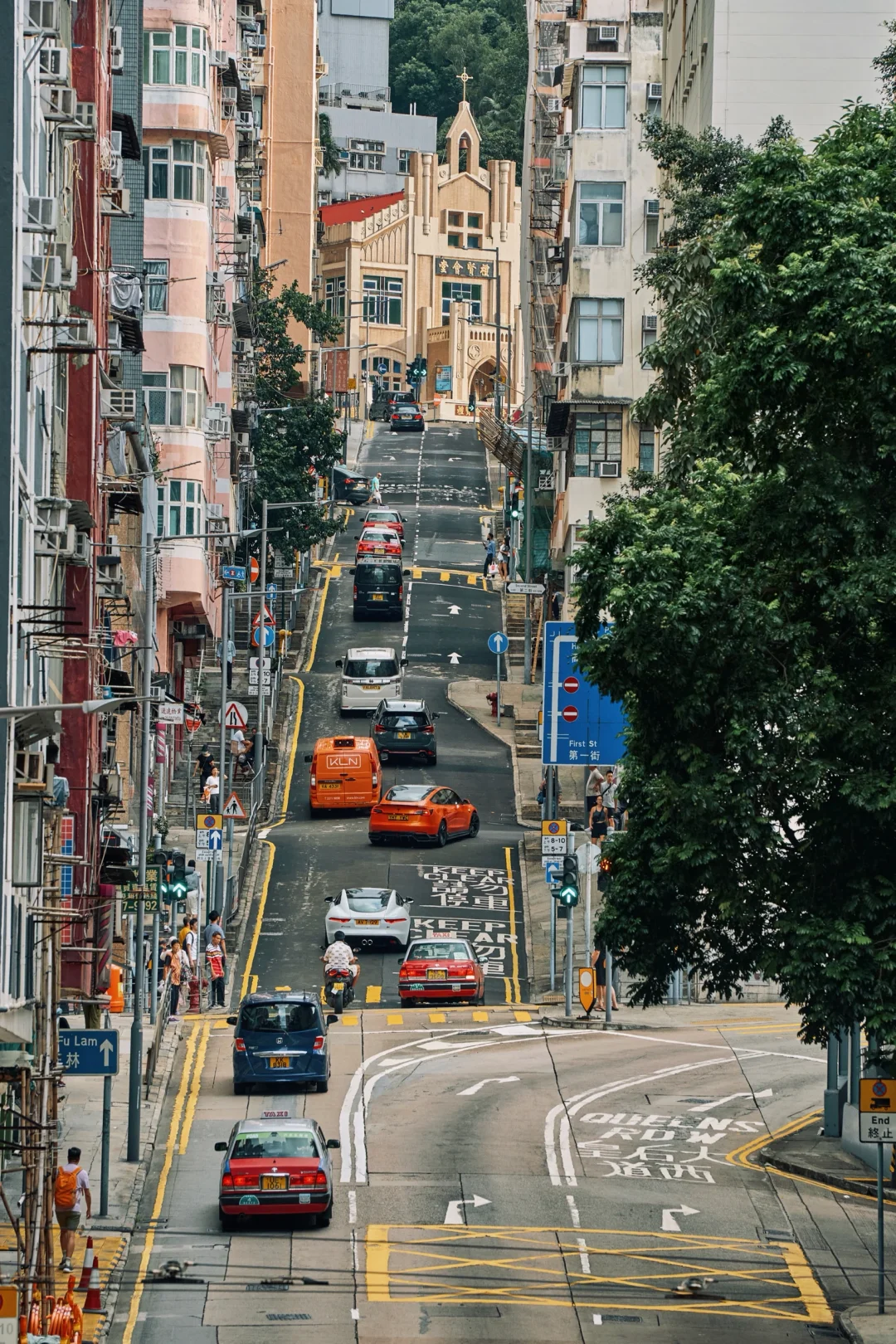 路窄且陡,自带天然纵深感,正街7-ELEVEN 路口陡坡拍出纵深感,富康楼天桥俯瞰会贤礼堂层次感拉满