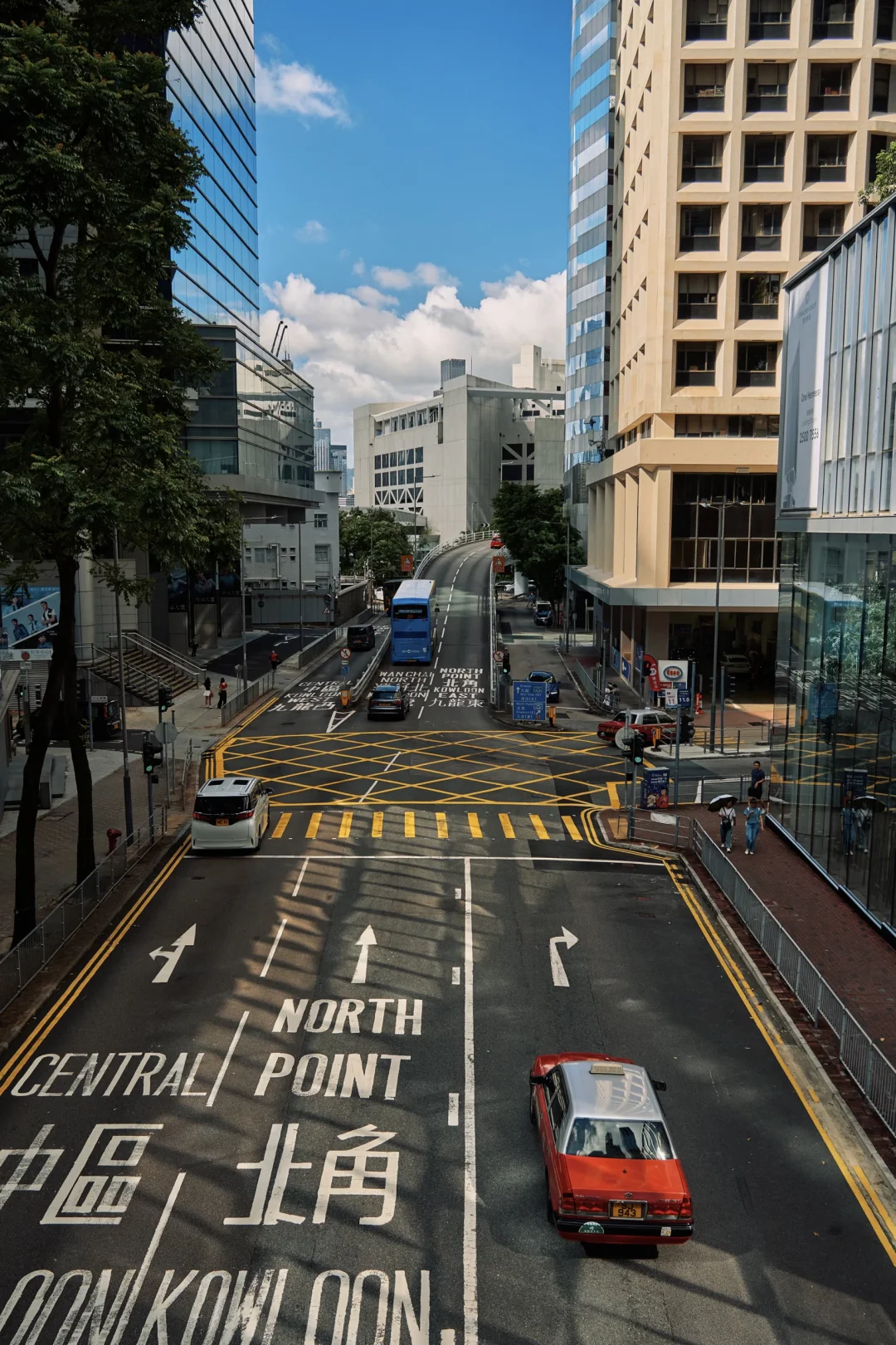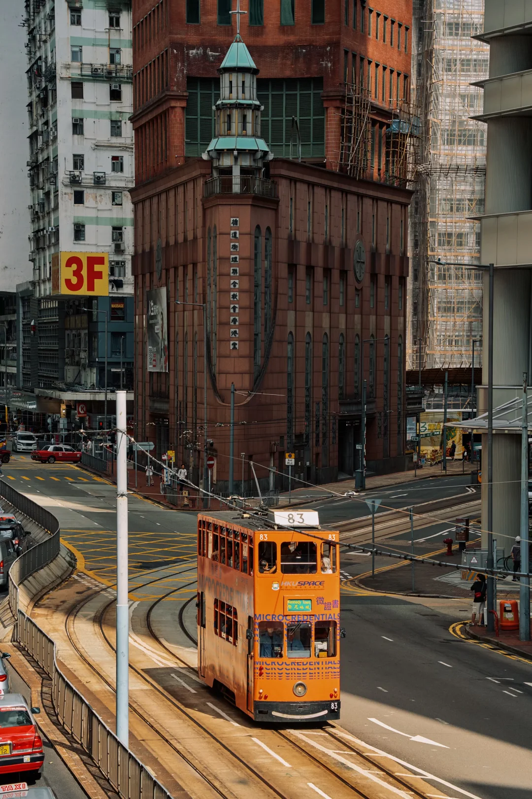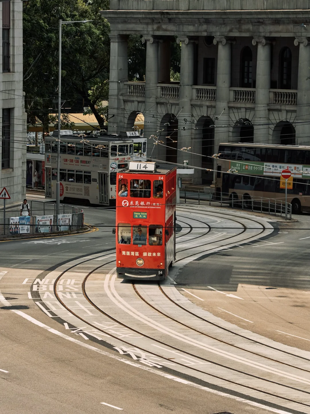 充满年代感的摩天大楼与叮叮车同框,在天桥另一侧,解锁通往北角的机位
