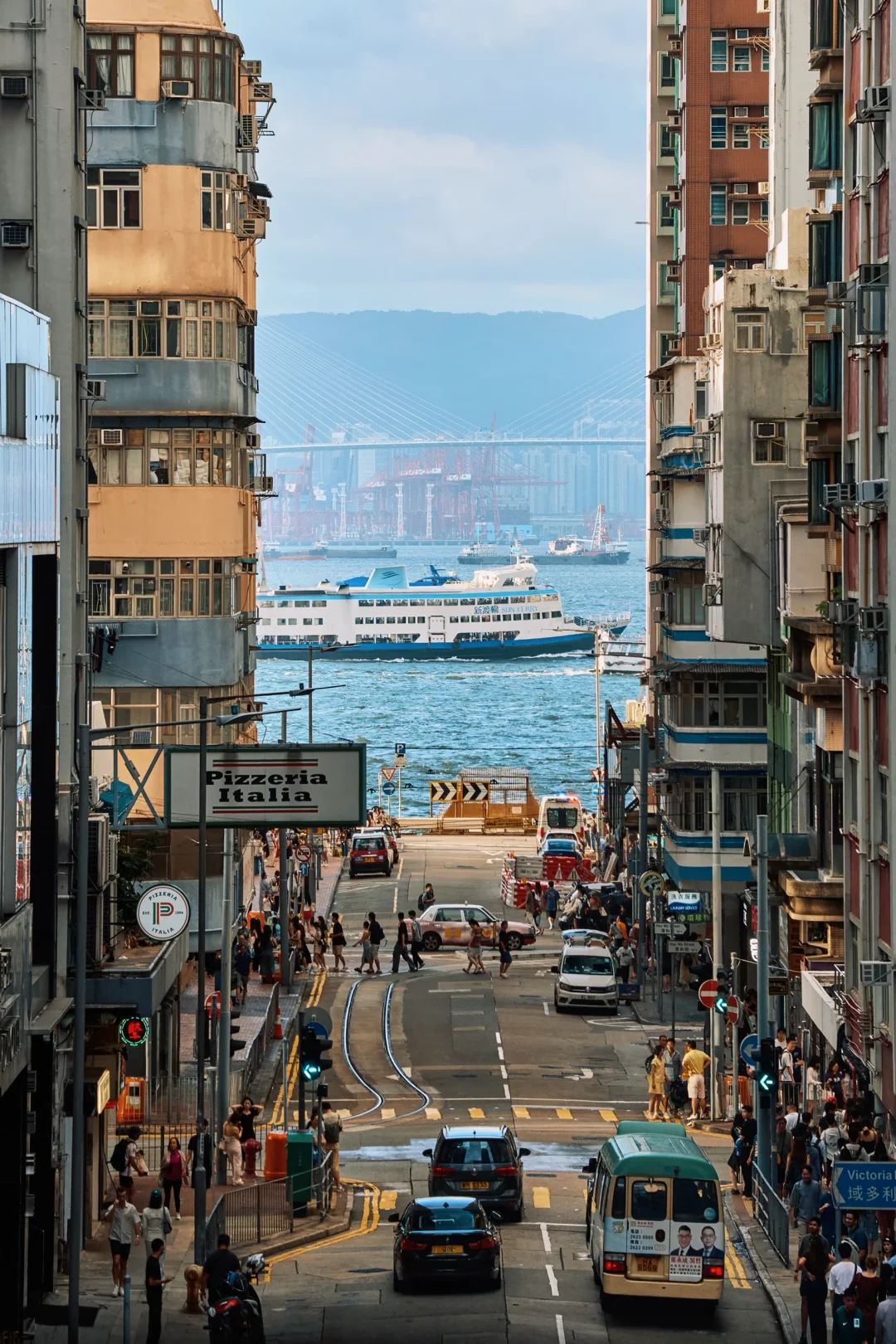 两旁高楼林立间行人车流穿梭,远海缓缓驶过邮轮,热闹与宁静在此奇妙共存。