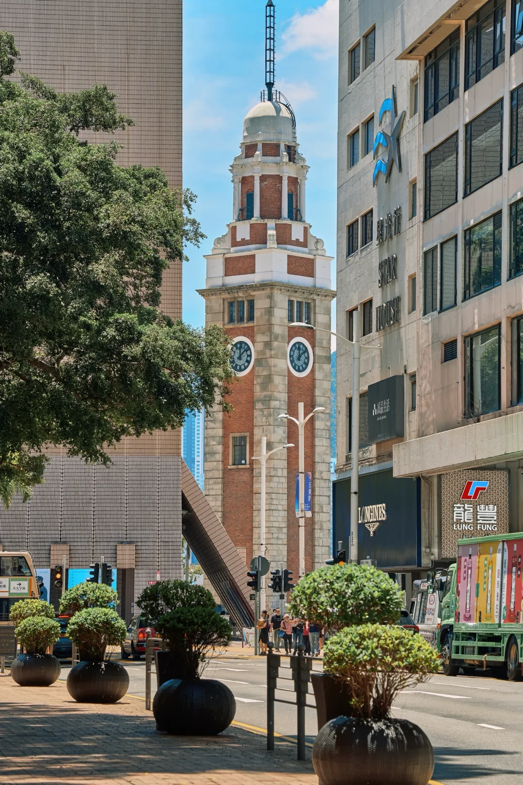 香港的经典地标,钟楼的复古轮廓搭配远处的海景和高楼