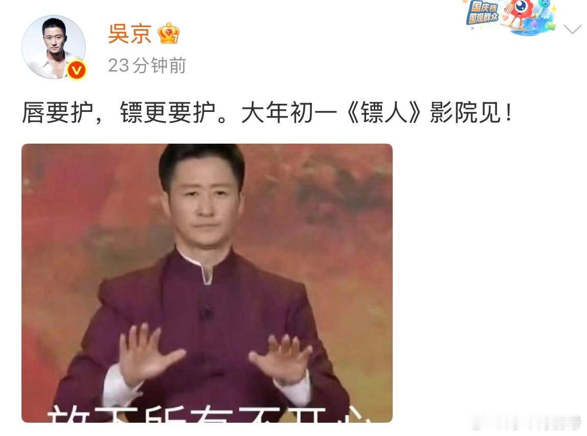 吴京回应唇部紧急护理 硬汉也有精致小细节,吴京亲自下场回应涂唇膏热搜,还花式cue《镖人》刀马护镖,这波联动太有梗!内娱互联网圣体名不虚传,大年初一蹲定《镖人》了~吴京 唇要护镖更要护