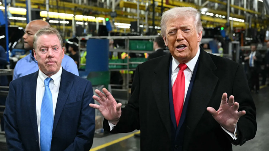 2026年1月13日,美国密歇根州迪尔伯恩市,美国总统唐纳德・特朗普在福特汽车公司鲁日河工厂参观时,与福特执行董事长比尔・福特同台发言。