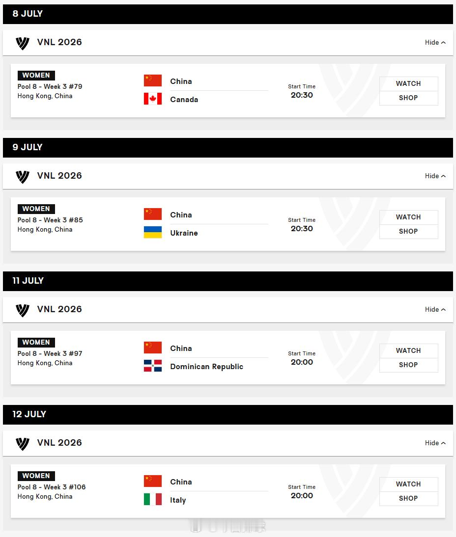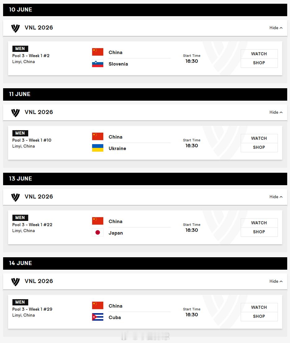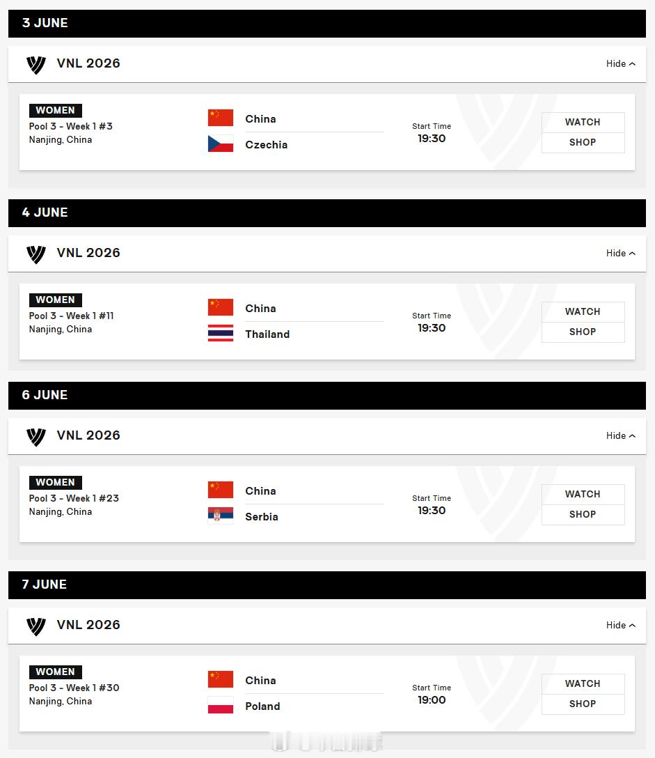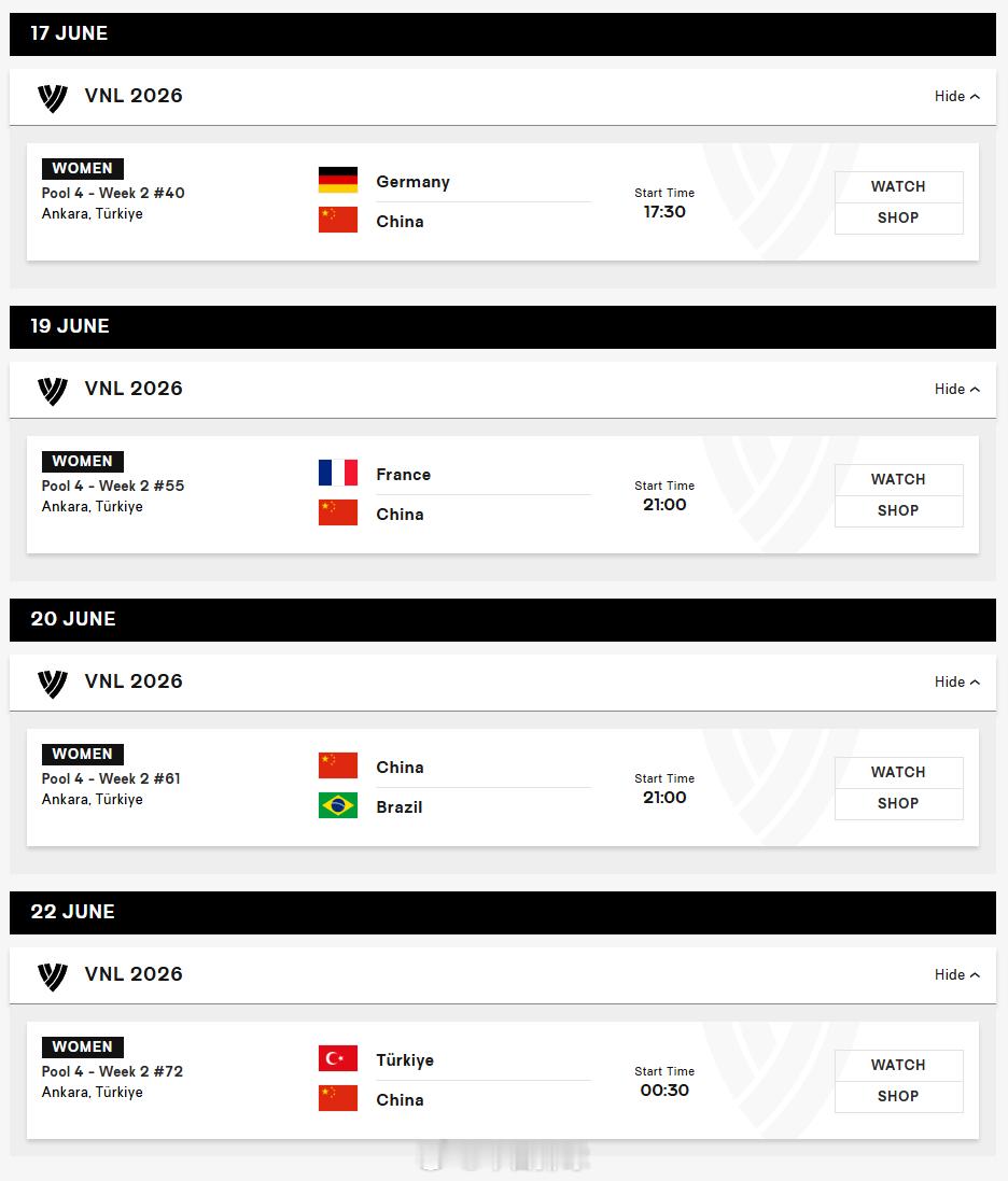 国际排联公布2026世界女排联赛 和2026世界男排联赛 分站赛的完全赛程(图一、图二/国际标准时间),中国排协同时公布第一周女排南京站、男排临沂站和第三周女排香港站的完全赛程(图三、图四和图五/北京时间)。中国女排 分站赛赛程如图六、图七和图八(北京时间),中国男排 分站赛赛程如图九、图十和图十一(北京时间)。