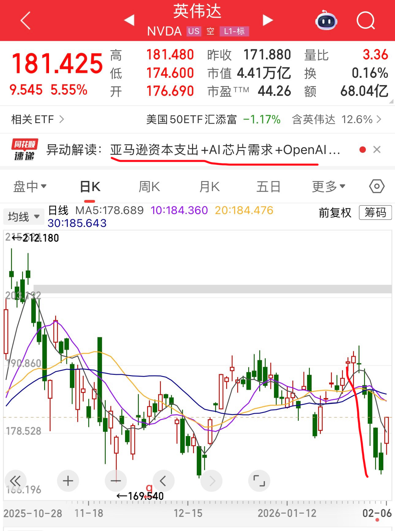 华尔街还没我的水平高,我都知道老美六巨头巨额资本支出,利好英伟达,结果英伟达股价连跌5天。今天反应过来了,说亚马逊巨额资本支出利好英伟达了。感谢华尔街连跌五天。让我捡到了便宜,等到了持仓19.61%的基金,一路下跌,今天抄到底了。如果纳指继续下跌,跌20%,其实更好,这样我就可以把老登股全卖了,去抄底。然后躺赢。