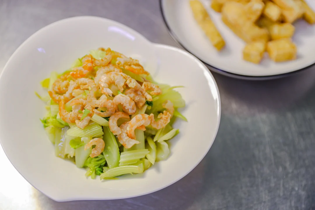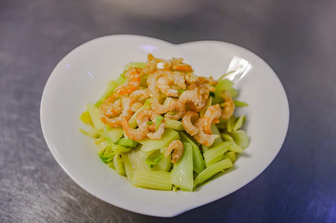4.西芹段放入碗中,加入盐,味精,香油拌均匀,把蒸好的金钩海米放上去即可。