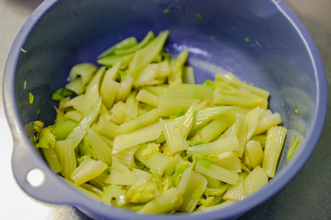 3.西芹洗净,切段,放入沸水中汆烫熟,捞出沥干水分。