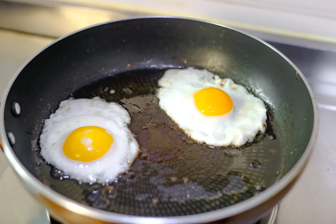 2.把鸡蛋打开,倒入锅中煎下。也可以把鸡蛋打散,做成蛋皮,切成丝。
