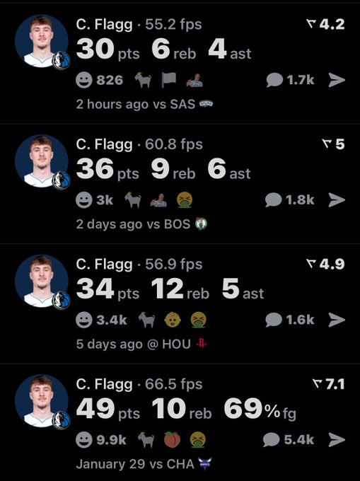 北京时间2月4日,达拉斯独行侠主场迎战波士顿凯尔特人,19岁新秀库珀·弗拉格再度上演惊艳表现。这位状元郎全场24投12中,轰下36分9篮板6助攻2盖帽的全面数据,尽管球队最终以103-113告负遭遇五连败,但弗拉格创造了NBA历史纪录——成为联盟首位连续三场比赛得分突破30分的20岁以下球员。过去三场比赛中,弗拉格分别对阵黄蜂、火箭和凯尔特人砍下49分、34分和36分,场均贡献39.7分10.3篮板4.7助攻,投篮命中率高达57.7%。在对阵凯尔特人的末节比赛中,当球队落后20分时,弗拉格在双人包夹下强打2+1得手,现场零星响起的"MVP"呼声印证了这位新星的统治级表现。NBA官方最新新秀榜显示,弗拉格已强势重返榜首位置。独行侠球员凯莱布·马丁评价道:"他真的与众不同,看到像他这样年龄的球员仍像海绵般学习,这太酷了。"尽管独行侠目前19胜31负的战绩已基本无缘季后赛,但管理层正效仿当年骑士培养詹姆斯的模式,全力锻造这位未来基石。弗拉格本人则表示:"我从未怀疑过自己,那些负面情绪都已过去,跌倒后我会变得更强大。"