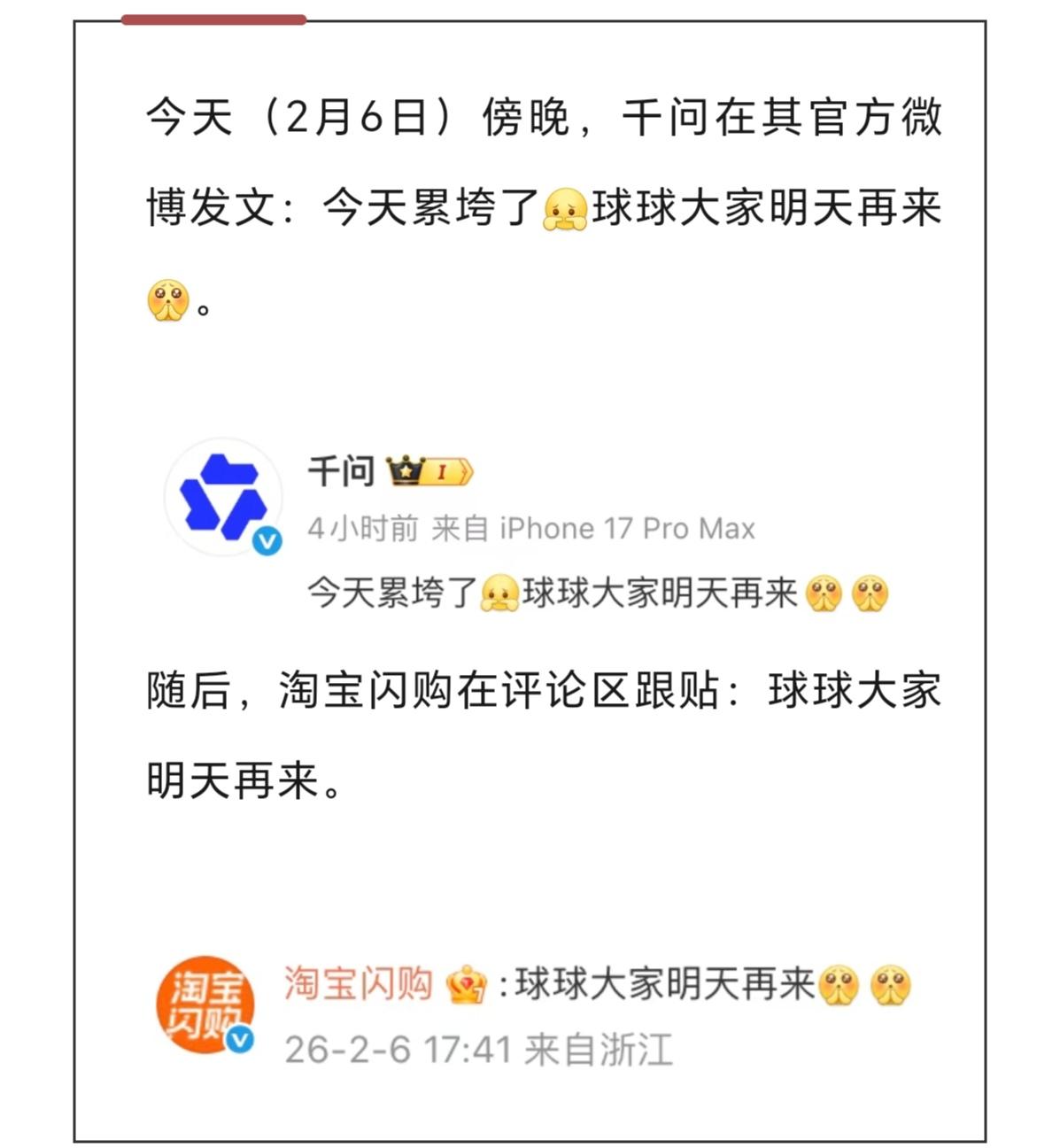 今天傍晚,千问、淘宝闪购纷纷发文:今天累垮了,求求大家明天再来!没想到,今天的奶茶大战,这么激烈。确实,今天千问ai系统,都被干崩溃了。 我试了一下午,也没能领取到奶茶券,访问的人太多,系统应对不过来。 部分奶茶品牌门店,估计也被订单干冒烟了。淘宝闪购,面对海量的奶茶订单,配送运力这块,估计今天也在承压。感觉,比夏天的外卖大战还激烈。