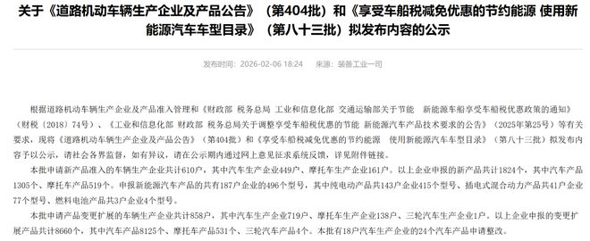 ▲工信部发布第404批《道路机动车辆生产企业及产品公告》