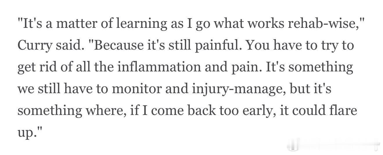 库里谈膝盖伤势,可能会继续缺席:“这是一个在康复过程中不断摸索、看看什么方法有效的问题,现在仍然会疼,你得想办法消除所有炎症和疼痛。仍然需要持续监控、进行伤病管理的情况;如果我回归得太早,伤势可能会再次加重、复发。”