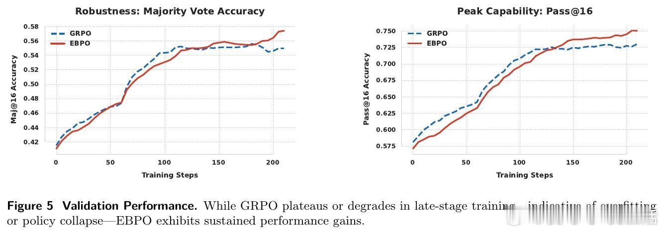 更深层的启发在于其对探索空间的保护。实验观察到,EBPO 能够有效地减缓策略熵的衰减。在强化学习中,过早的收敛往往意味着平庸,而 EBPO 通过全局正则化,让模型在追求高奖励的同时,保持了对未知解法的好奇心。这种在稳定与探索之间的精妙平衡,是其通往竞赛级推理能力的关键。