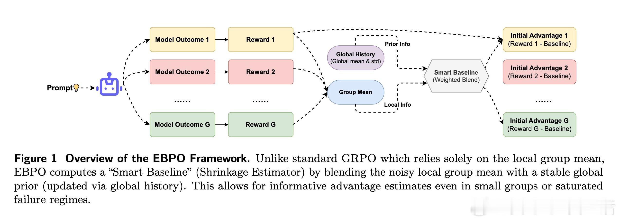EBPO 的核心思想在于经验贝叶斯中的借力。它不再孤立地看待每一个问题,而是通过收缩估计量,将局部的、高噪声的组内统计数据拉向全局的策略表现分布。这就像一位经验丰富的导师,即便全班学生在某道难题上集体落败,他也能根据以往的教学大数据判断出:这是题目本身超纲,还是学生在基础逻辑上出现了偏差,从而给出精准的反馈。