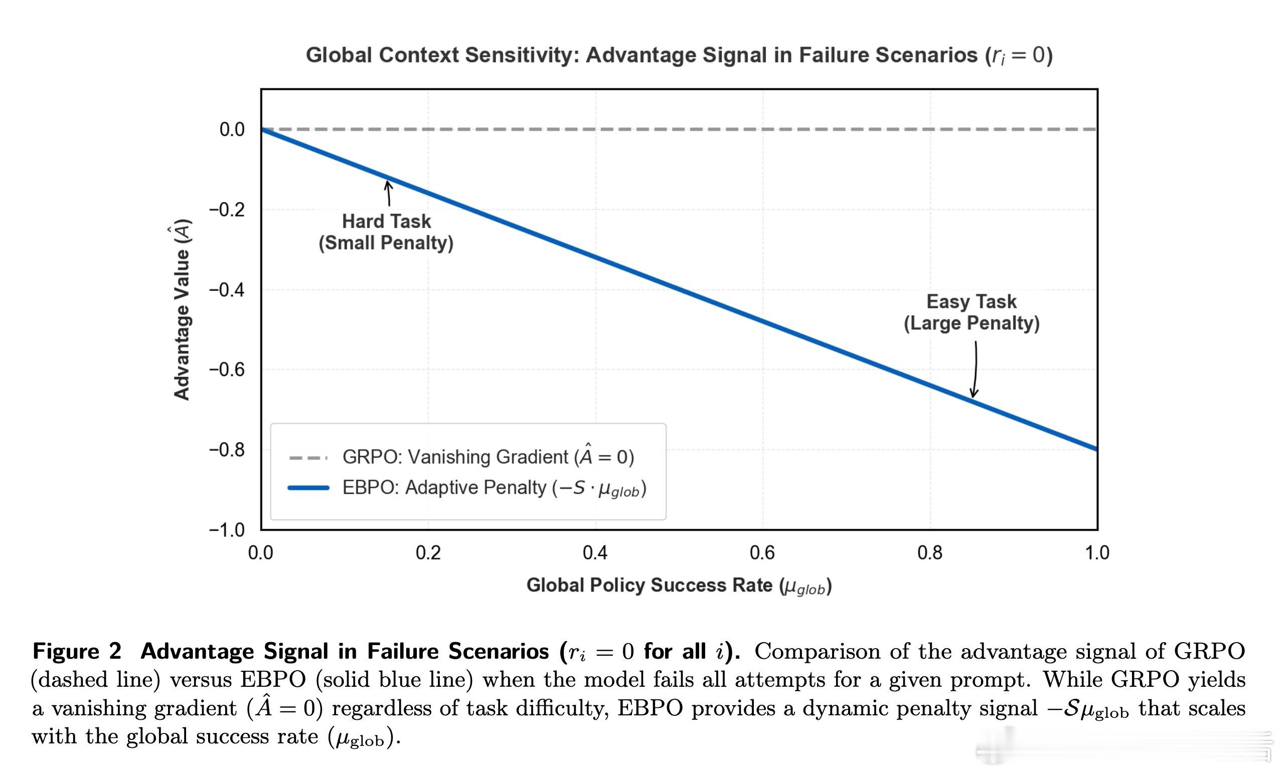 大模型推理能力的提升,正从单纯的规模扩张转向精细的强化学习。DeepSeek 带来的 GRPO 架构虽然通过取消评论者网络实现了高效训练,但在实际操作中却面临一个隐蔽而致命的困境:当模型面对难题全军覆没、所有尝试都得到零分时,相对优势会消失,梯度信号随之枯竭。这意味着昂贵的算力在这些关键的失败步长中被完全浪费了。本文提出的 EBPO(经验贝叶斯策略优化)正是为了打破这种沉默。
