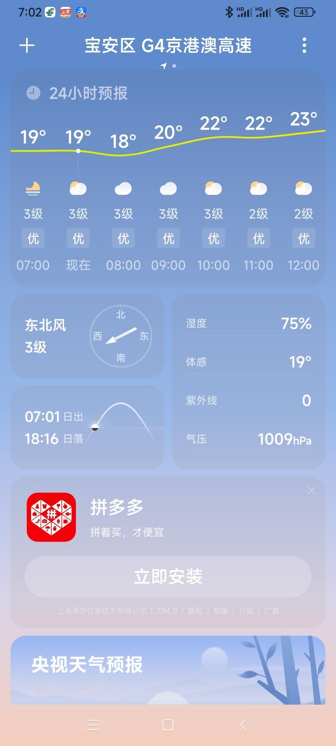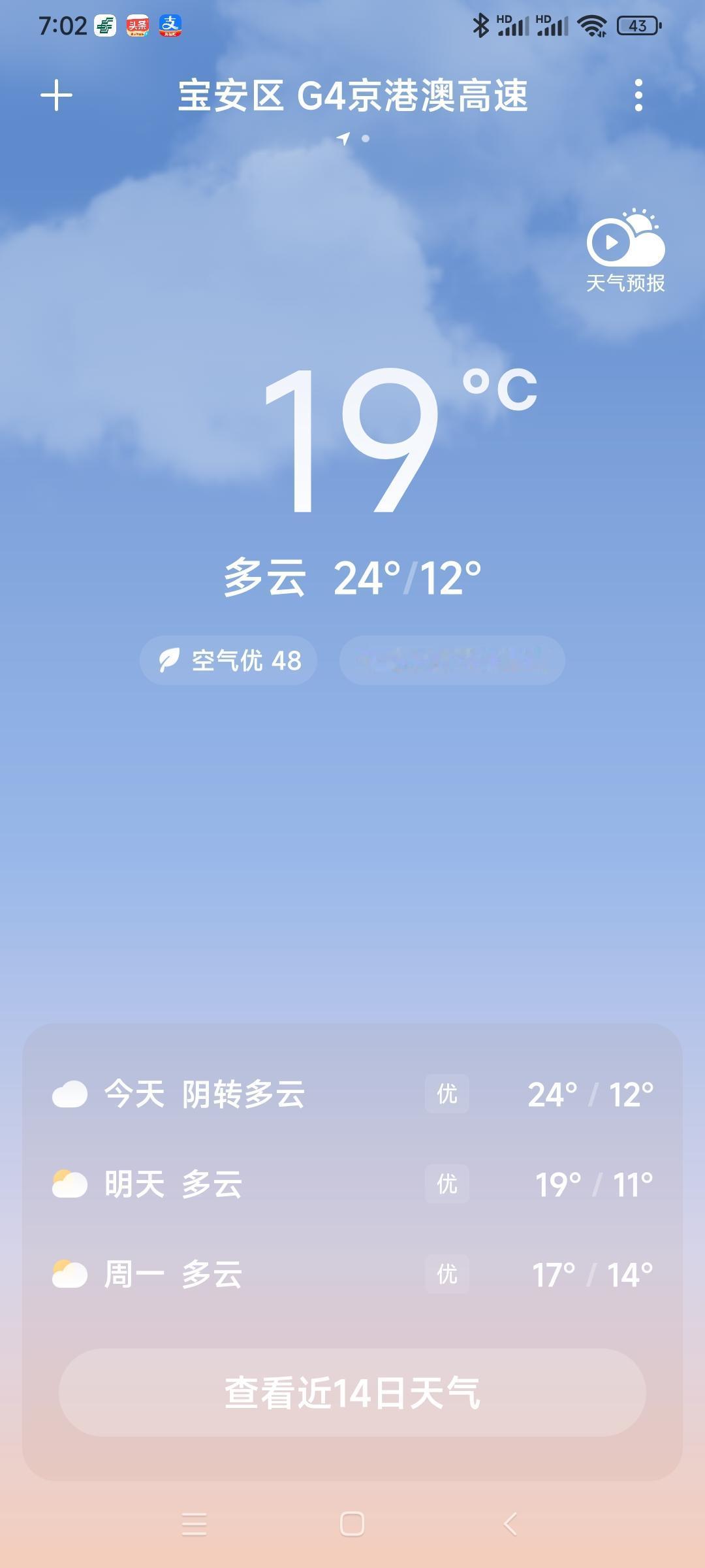 我的今日状态:😁轻松愉快 我这里的天气:🌤️多云深圳今日阴转多云,气温12度