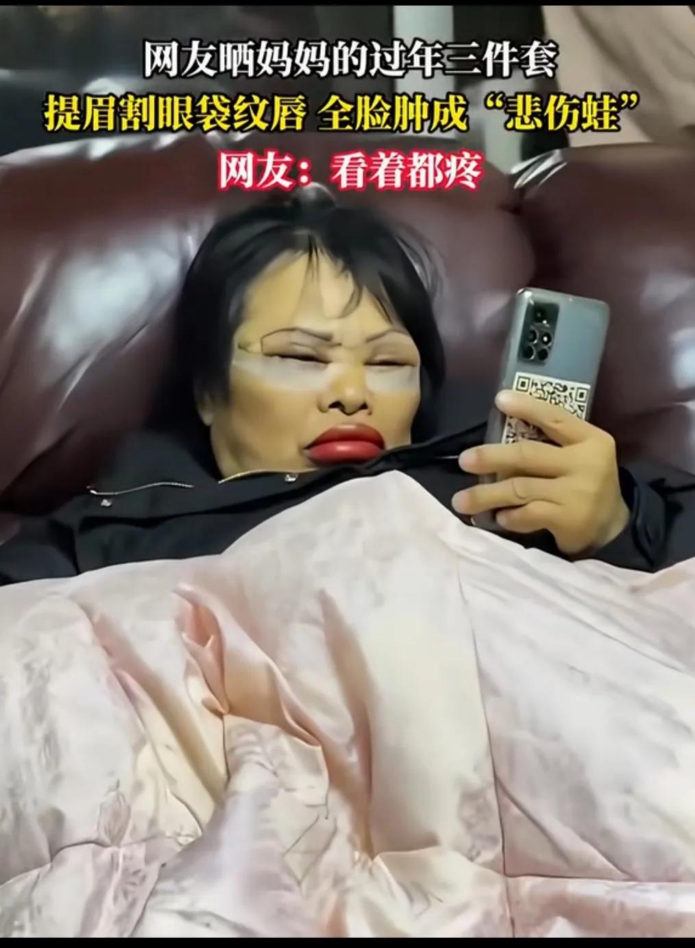网友晒出爱美的妈妈,想美美哒过年,给自己定制三件套,纹唇,割眼袋,提眉。 做完这些项目,结果变成了这般模样,肿的没法看,成了香肠嘴。 这下好了,过年都没脸见人。