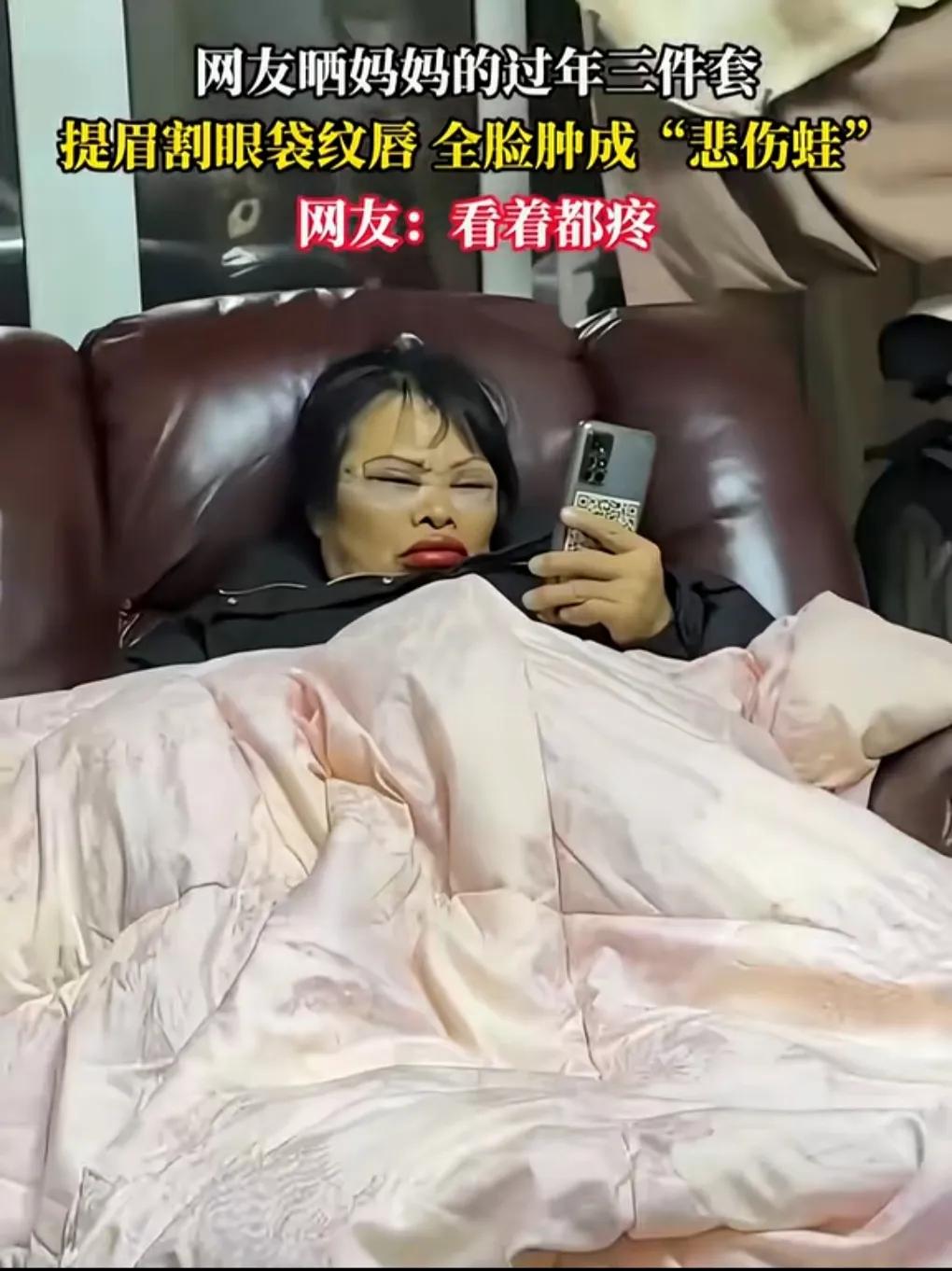 网友晒出爱美的妈妈,想美美哒过年,给自己定制三件套,纹唇,割眼袋,提眉。 做完